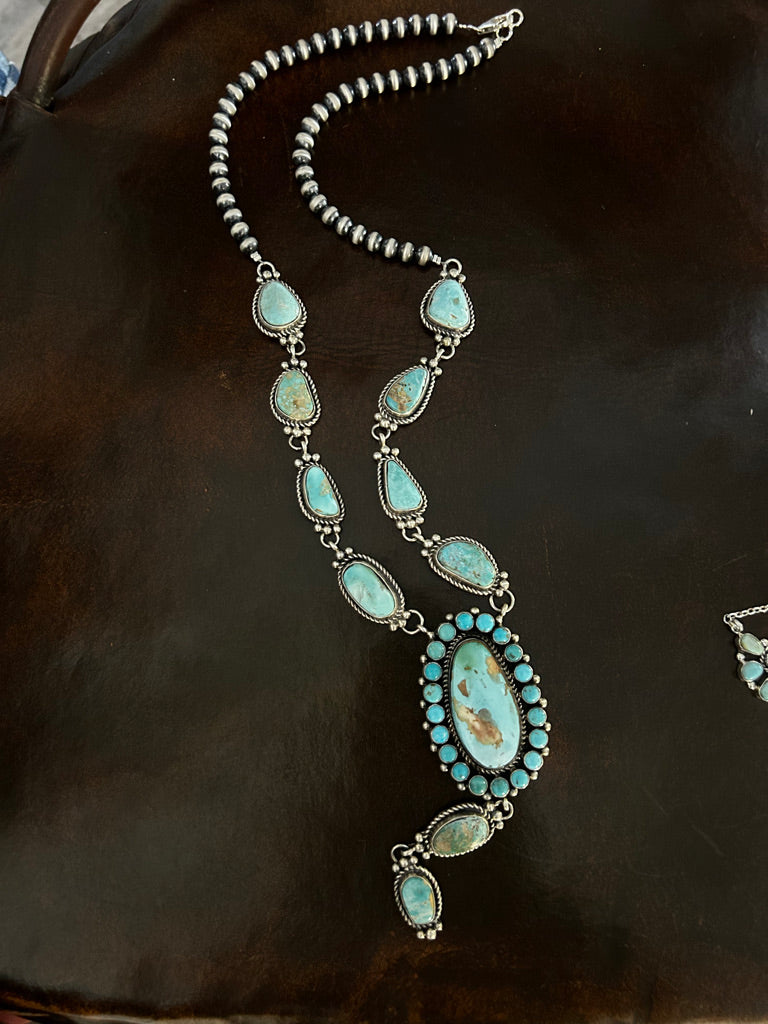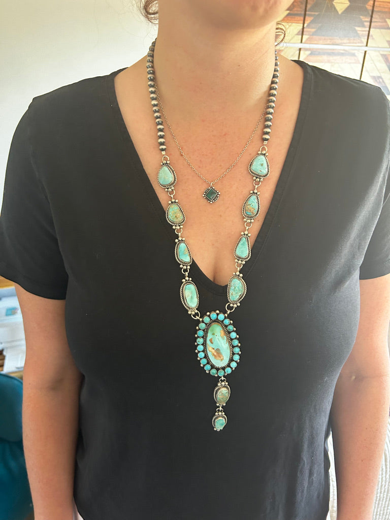 36" top to bottom. Very stunning and not as full of a commitment as a squash blossom. Very well made, signed by maker Kathleen Yazzie.